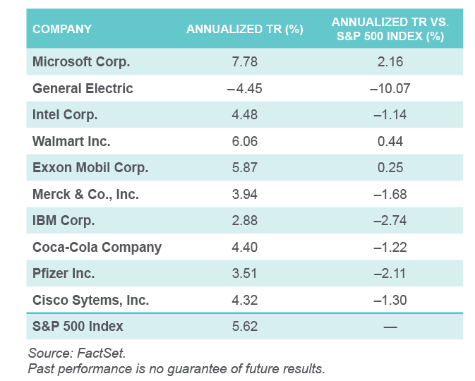 To answer this question, we look at the mega-cap stocks of yesteryear and see how they have performed (and changed) over time. The table below shows the 10 largest stocks in the S&P 500 as of 20 years ago and their annualized total return, as of December 31, 2018: